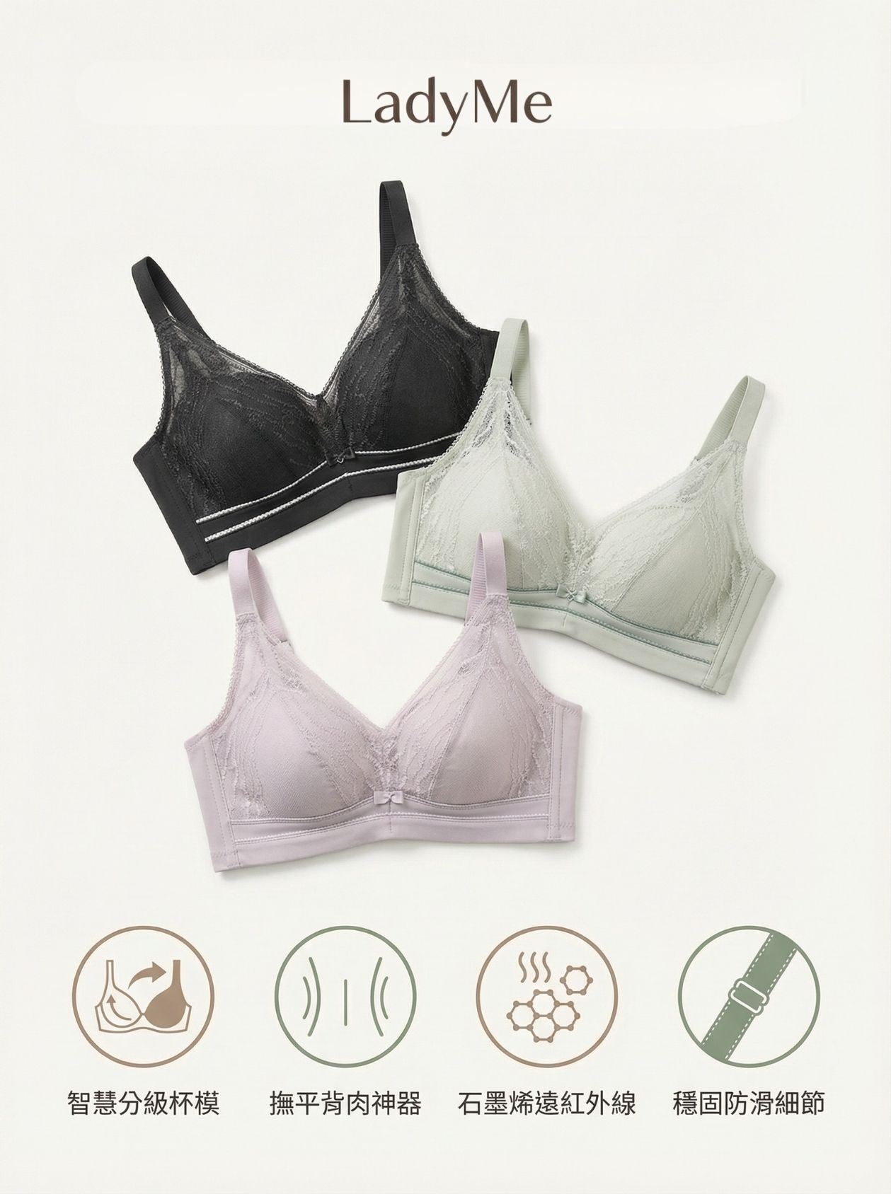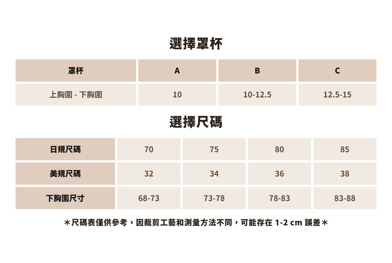 • 智慧分級杯模:下厚杯專寵 AB 罩杯,均勻杯貼合 BC 罩杯