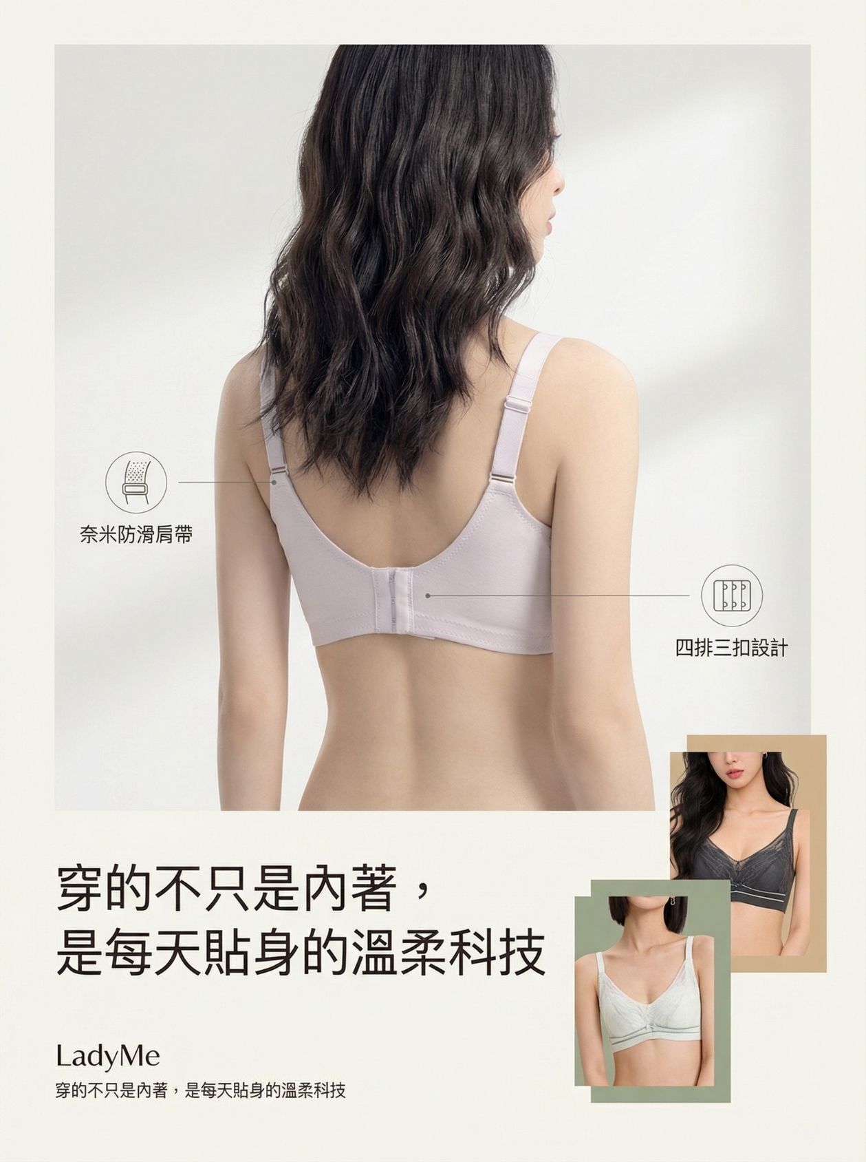 • 穩固防滑細節:奈米防滑肩帶細膩不磨皮,搭配四排三扣設計