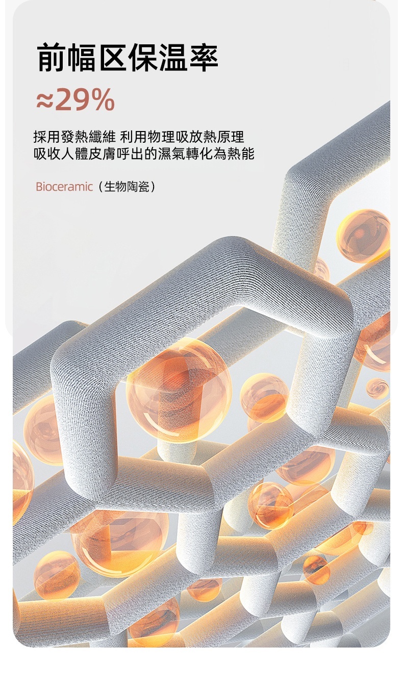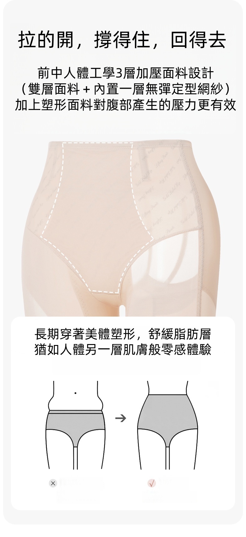 •腹部三層加壓,裡層使用生物陶瓷功能印花,發熱纖維,利用物理吸放熱原理,吸收人體皮膚呼出的溼氣轉化為熱能,而且緊而不勒,收緊小肚子