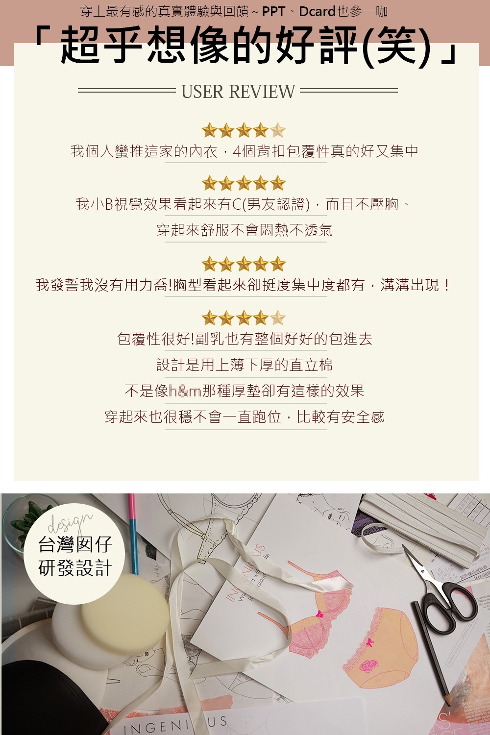 •罩杯內側、底褲面料添加「膠原蛋白」保濕,「氧化鋅」抗菌清爽無異味