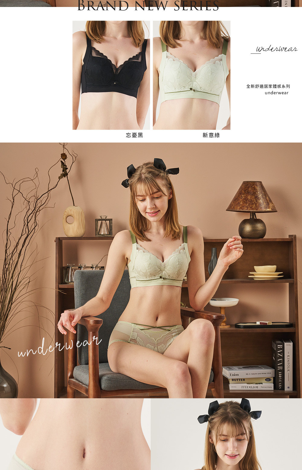 •杯面採用進口高端蕾絲,別緻時尚(綠色肩帶和下圍線條撞色設計)