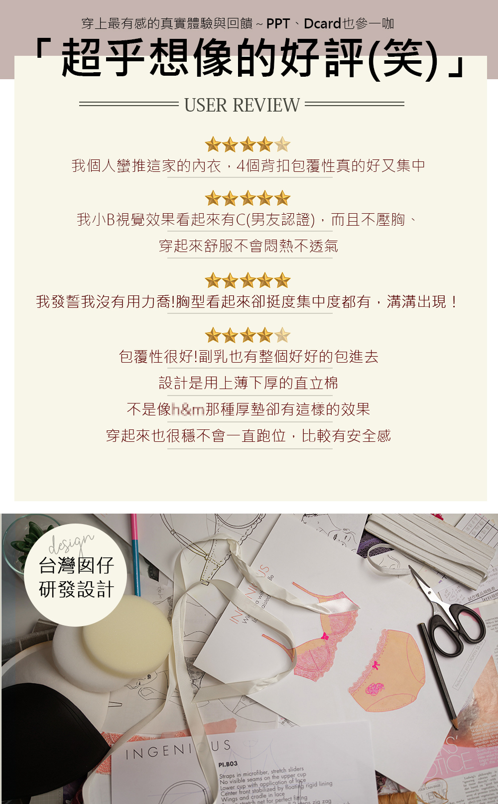 •一體成型,舒適服貼杯型,不壓胸,創造豐挺效果