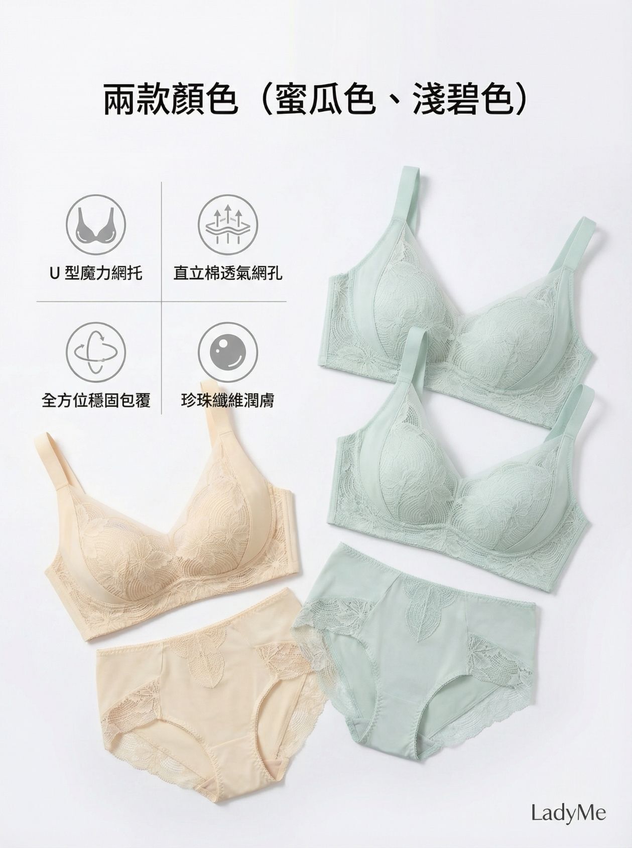 • 珍珠纖維潤膚:罩杯與褲底皆使用珍珠纖維,潤澤呵護嫩膚